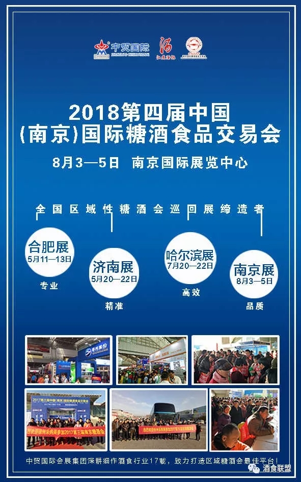 中貿(mào)集團(tuán)2018年計(jì)劃將在山東濟(jì)南、安徽合肥、江蘇南京、黑龍江哈爾濱、浙江杭州等省市舉辦十余場(chǎng)次酒博會(huì)、食品展、餐飲展,形成聯(lián)動(dòng)招商、資源互動(dòng)和共享。
